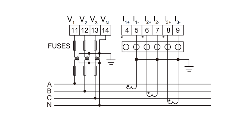 | Ingång | Anslutning | Enfas-2-tråd, 3-fas-3-tråd, 3-fas-4-tråd | ||